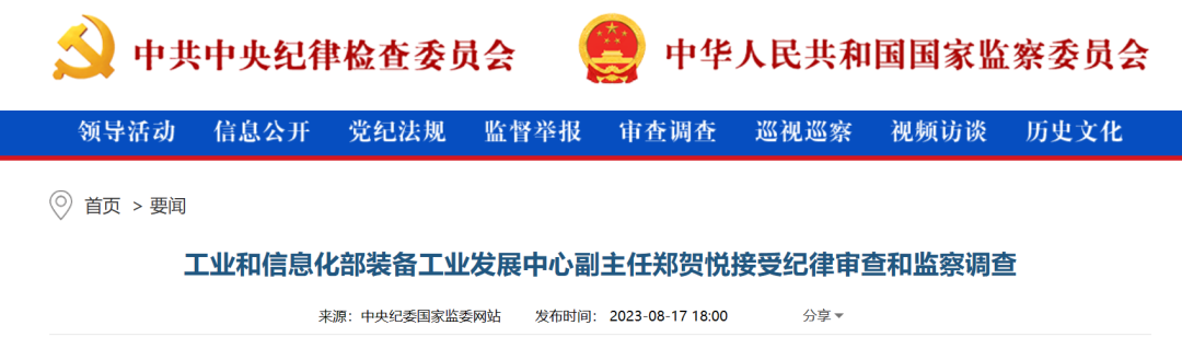 中央紀委國家監(jiān)委網(wǎng)站8月17日消息,據(jù)中央紀委國家監(jiān)委駐工業(yè)和信息化部紀檢監(jiān)察組、云南省紀委監(jiān)委消息:工業(yè)和信息化部裝備工業(yè)發(fā)展中心副主任鄭賀悅涉嫌嚴重違紀違法,目前正接受中央紀委國家監(jiān)委駐工業(yè)和信息化部紀檢監(jiān)察組紀律審查和云南省普洱市監(jiān)委監(jiān)察調(diào)查。
