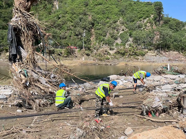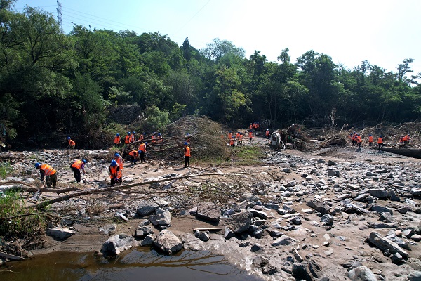 受臺(tái)風(fēng)“杜蘇芮”影響,門頭溝區(qū)遭遇極端降雨災(zāi)害,轄區(qū)河道水庫(kù)塘壩內(nèi)出現(xiàn)大量倒伏枯死林木、垃圾、建筑殘骸、車輛、淤泥,嚴(yán)重污染河湖環(huán)境,阻礙河道行洪。8月16日,中國(guó)能建葛洲壩集團(tuán)五家參建單位派出320余人,挖掘機(jī)32臺(tái)、鏟車12輛、油鋸120把、吊車5臺(tái)、運(yùn)輸車25輛,擔(dān)負(fù)門頭溝12.9公里的河道清淤、樹(shù)木清理等任務(wù)。