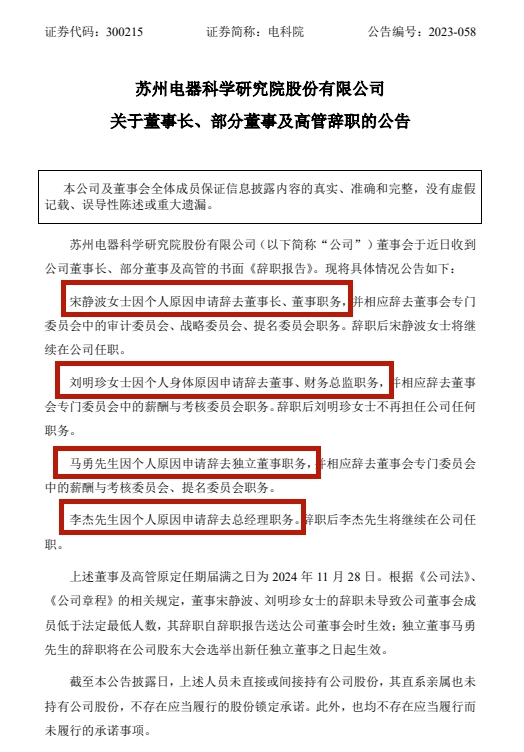 在父子“內(nèi)斗”形勢明朗,父親胡德霖去世,胡醇及其母成為公司實際控制人之后,電科院9月1日晚間發(fā)布公告,包括董事長、總經(jīng)理、財務(wù)總監(jiān)在內(nèi),多人宣布辭職。