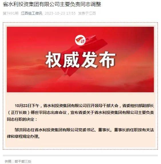 鄒洪同志任江西省水利投資集團(tuán)有限公司黨委書(shū)記、董事長(zhǎng)。董事長(zhǎng)的任職按有關(guān)法律和章程規(guī)定辦理。