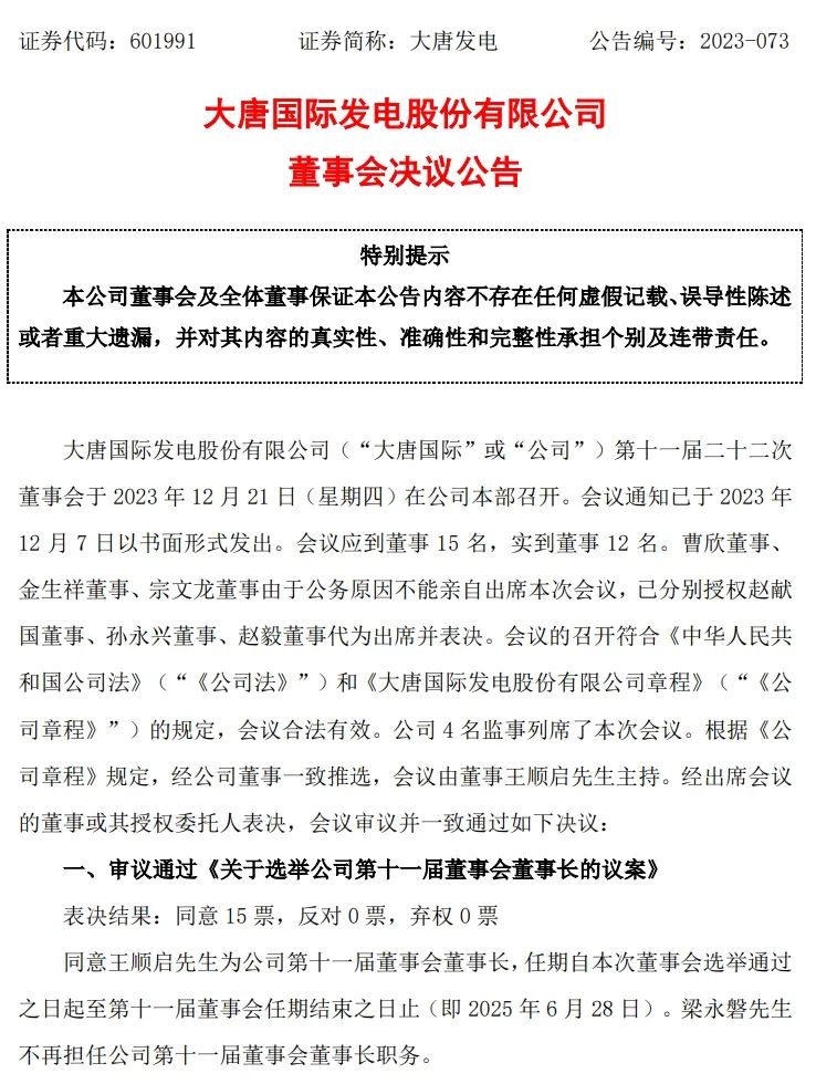 12月21日,大唐國際發(fā)布公告,大唐國際發(fā)電股份有限公司第十一屆二十二次董事會于12月21日召開,審議通過《關(guān)于選舉公司第十一屆董事會董事長的議案》,同意王順啟為公司第十一屆董事會董事長。梁永磐不再擔任公司第十一屆董事會董事長職務。