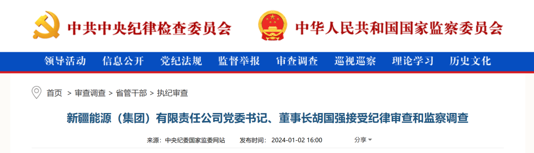 據(jù)中央紀(jì)委國(guó)家監(jiān)委網(wǎng)站1月2日消息,據(jù)新疆維吾爾自治區(qū)紀(jì)委監(jiān)委消息:新疆能源(集團(tuán))有限責(zé)任公司黨委書(shū)記、董事長(zhǎng)胡國(guó)強(qiáng)涉嫌嚴(yán)重違紀(jì)違法,目前正接受新疆維吾爾自治區(qū)紀(jì)委監(jiān)委紀(jì)律審查和監(jiān)察調(diào)查。