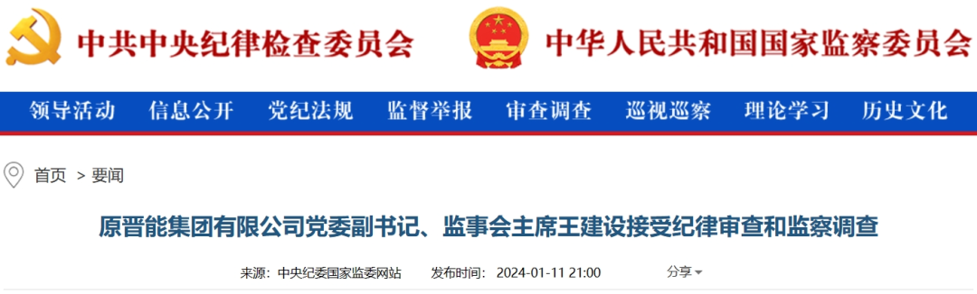 中央紀(jì)委國家監(jiān)委網(wǎng)站1月11日消息,據(jù)山西省紀(jì)委監(jiān)委消息:原晉能集團(tuán)有限公司黨委副書記、監(jiān)事會主席王建設(shè)涉嫌嚴(yán)重違紀(jì)違法,目前正接受山西省紀(jì)委監(jiān)委紀(jì)律審查和監(jiān)察調(diào)查。