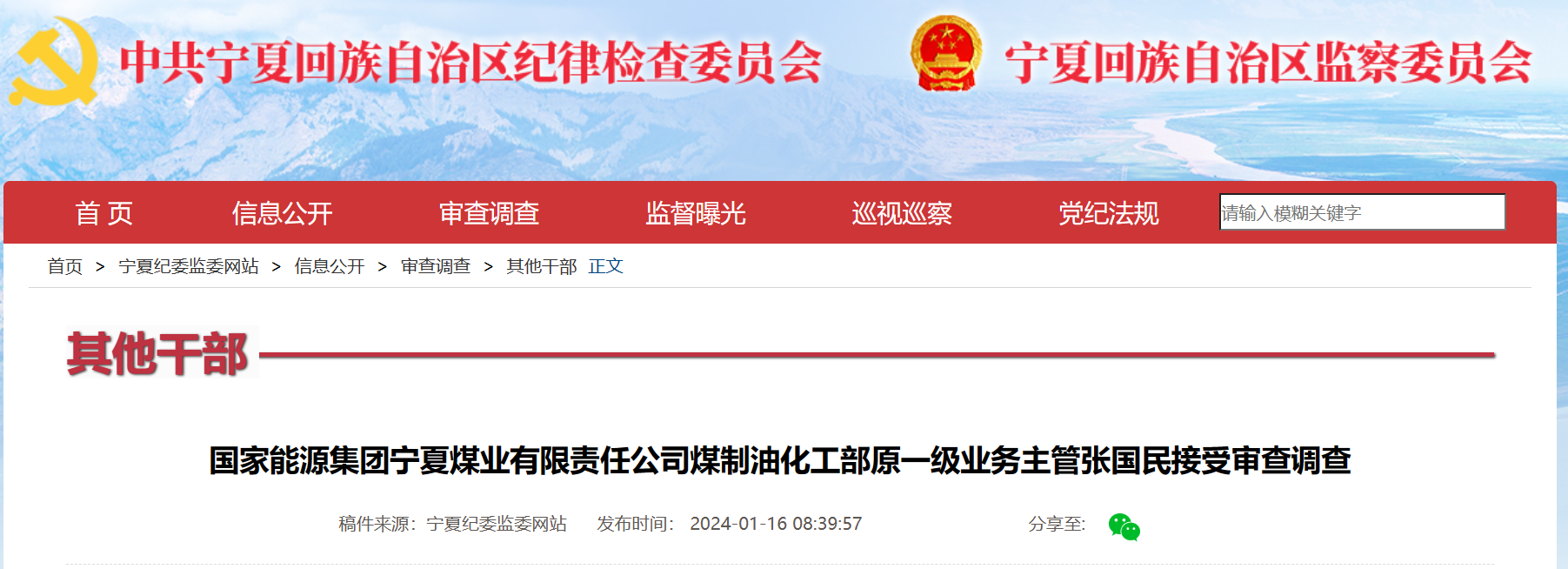 據(jù)國家能源集團寧夏煤業(yè)有限責任公司紀委、吳忠市紀委監(jiān)委消息:國家能源集團寧夏煤業(yè)有限責任公司煤制油化工部原一級業(yè)務主管張國民涉嫌嚴重違紀違法,目前正接受國家能源集團寧夏煤業(yè)有限責任公司紀委紀律審查和吳忠市監(jiān)委監(jiān)察調查。