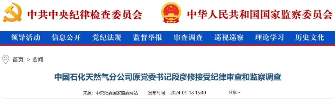 中央紀(jì)委國(guó)家監(jiān)委網(wǎng)站1月18日消息,據(jù)中國(guó)石化紀(jì)檢監(jiān)察組、山東省紀(jì)委監(jiān)委消息:中國(guó)石化天然氣分公司原黨委書記段彥修涉嫌嚴(yán)重違紀(jì)違法,目前正接受中國(guó)石化紀(jì)檢監(jiān)察組和山東省濱州市監(jiān)委紀(jì)律審查和監(jiān)察調(diào)查。