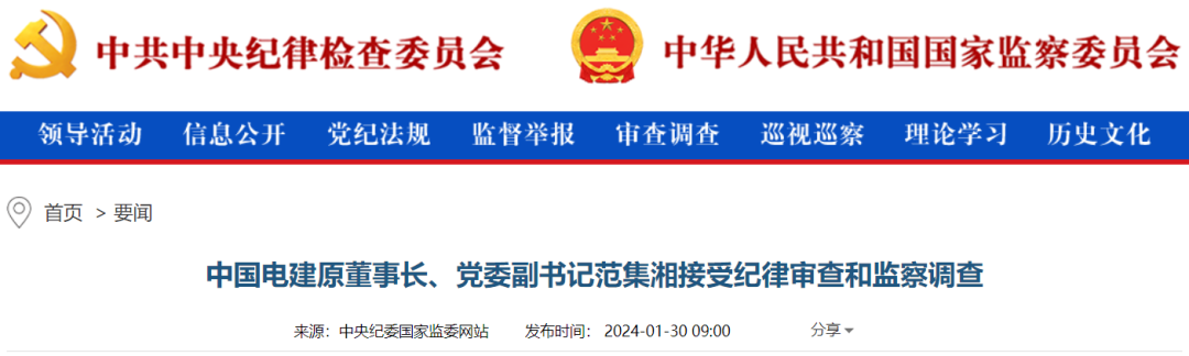 2024年1月30日,據(jù)中央紀委國家監(jiān)委駐國務(wù)院國資委紀檢監(jiān)察組、江西省紀委監(jiān)委消息:中國電建原董事長、黨委副書記范集湘涉嫌嚴重違紀違法,接受中央紀委國家監(jiān)委駐國務(wù)院國資委紀檢監(jiān)察組和江西省監(jiān)委紀律審查和監(jiān)察調(diào)查。