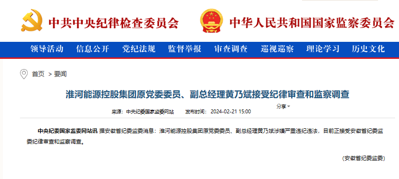 據(jù)安徽省紀(jì)委監(jiān)委消息:淮河能源控股集團(tuán)原黨委委員、副總經(jīng)理黃乃斌涉嫌嚴(yán)重違紀(jì)違法,目前正接受安徽省紀(jì)委監(jiān)委紀(jì)律審查和監(jiān)察調(diào)查。