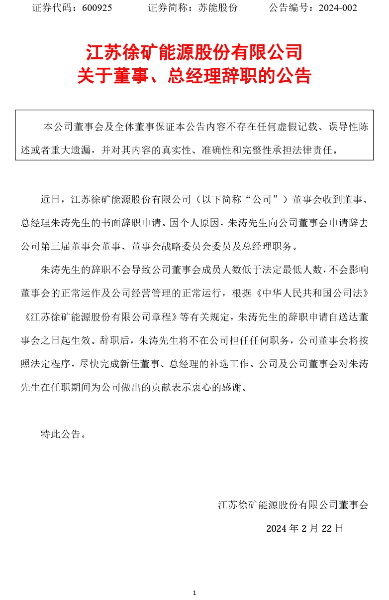 2月22日,蘇能股份發(fā)布公告,近日,董事會(huì)收到董事、總經(jīng)理朱濤先生的書面辭職申請(qǐng)。因個(gè)人原因,朱濤先生向公司董事會(huì)申請(qǐng)辭去公司第三屆董事會(huì)董事、董事會(huì)戰(zhàn)略委員會(huì)委員及總經(jīng)理職務(wù)。