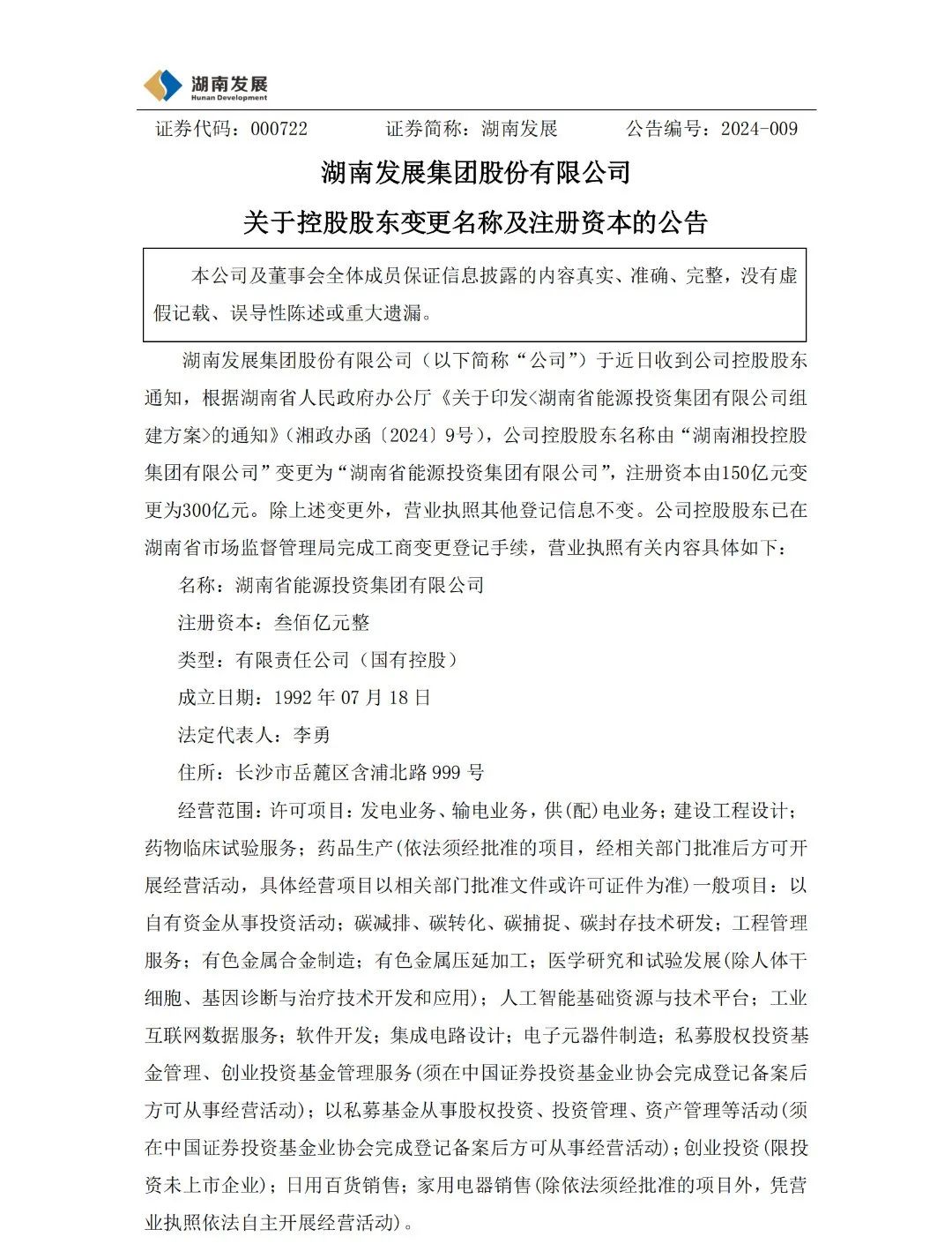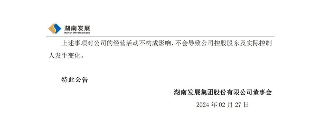 2月27日,湖南發(fā)展集團(tuán)股份有限公司發(fā)布關(guān)于控股股東變更名稱及注冊(cè)資本的公告,公告顯示:湖南發(fā)展集團(tuán)股份有限公司于近日收到公司控股股東通知,根據(jù)湖南省人民政府辦公廳《關(guān)于印發(fā)<湖南省能源投資集團(tuán)有限公司組建方案>的通知》(湘政辦函〔2024〕9號(hào)),公司控股股東名稱由“湖南湘投控股集團(tuán)有限公司”變更為“湖南省能源投資集團(tuán)有限公司”,注冊(cè)資本由150億元變更為300億元。除上述變更外,營(yíng)業(yè)執(zhí)照其他登記信息不變。公司控股股東已在湖南省市場(chǎng)監(jiān)督管理局完成工商變更登記手續(xù)。
