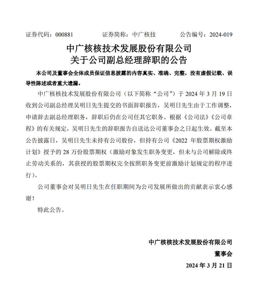 3月21日,中廣核技發(fā)布公告稱,公司于3月19日收到公司副總經理吳明日先生提交的書面辭職報告,吳明日先生由于工作調整,申請辭去副總經理職務,辭職后仍在公司任其它職務。