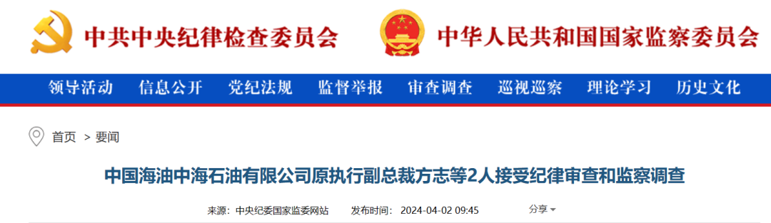 中央紀(jì)委國家監(jiān)委網(wǎng)站4月2日消息,據(jù)中國海油紀(jì)檢監(jiān)察組、江蘇省紀(jì)委監(jiān)委消息:中國海油中海石油有限公司原執(zhí)行副總裁方志、中國海油中海石油(中國)有限公司天津分公司渤海地區(qū)協(xié)調(diào)工作領(lǐng)導(dǎo)小組原專職副組長陳明涉嫌嚴(yán)重違紀(jì)違法,目前正接受中國海油紀(jì)檢監(jiān)察組和江蘇省監(jiān)委紀(jì)律審查和監(jiān)察調(diào)查。