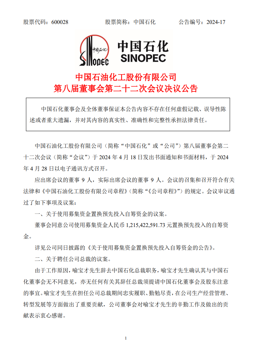 4月29日,中國石化發(fā)布公告稱,由于工作原因,喻寶才先生辭去中國石化總裁職務。董事會聘任趙東先生為中國石化總裁,同時調整為執(zhí)行董事,聘期自董事會批準之日起至第八屆董事會任期屆滿時止。