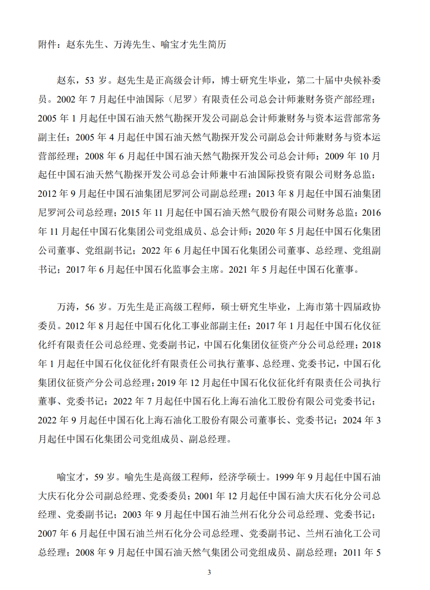 此外,按照《公司章程》的規(guī)定,根據總裁提名,董事會聘任萬濤先生、喻寶才先生為中國石化高級副總裁,聘期自董事會批準之日起至第八屆董事會任期屆滿時止。