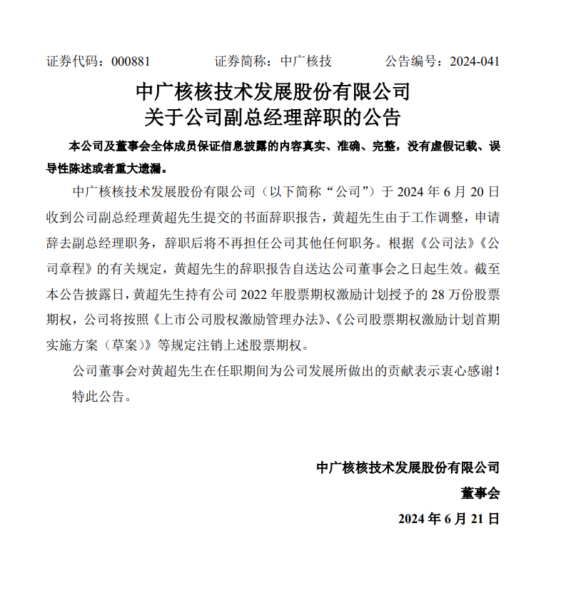 黃超辭去中廣核核技術發(fā)展股份有限公司(以下簡稱“中廣核技”)副總經(jīng)理職務。