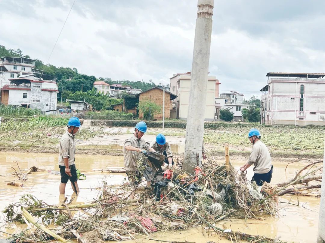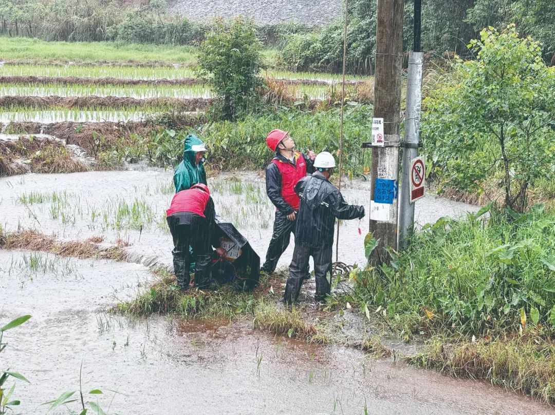 ▲圖為6月17日,國(guó)網(wǎng)福建永定區(qū)供電公司支援搶修隊(duì)伍對(duì)上杭縣10千伏稔洪線電桿傾斜現(xiàn)場(chǎng)開展搶修工作。黃小芬/攝