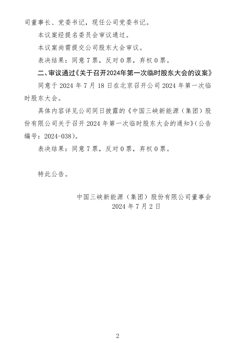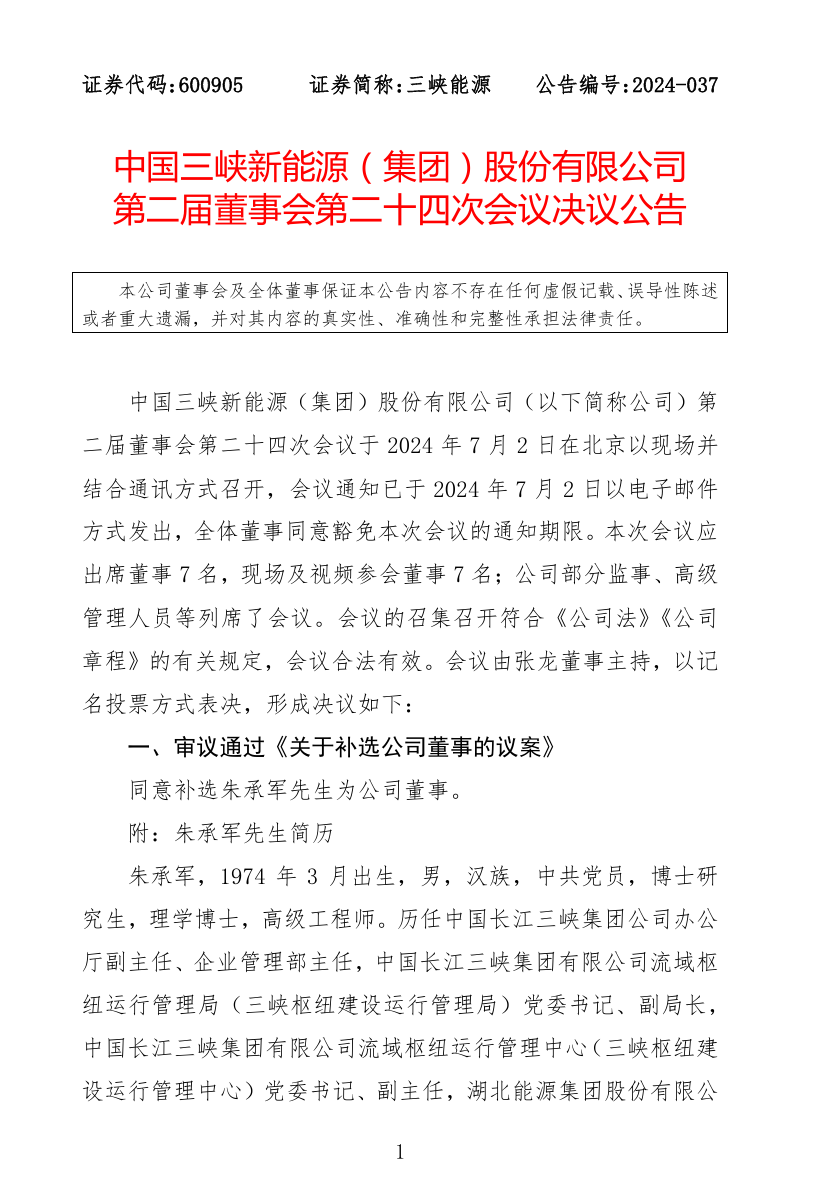 7月2日,三峽能源發(fā)布公告稱,公司第二屆董事會(huì)第二十四次會(huì)議于7月2日召開。會(huì)議審議通過《關(guān)于補(bǔ)選公司董事的議案》, 同意補(bǔ)選朱承軍先生為公司董事。