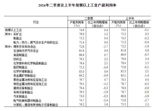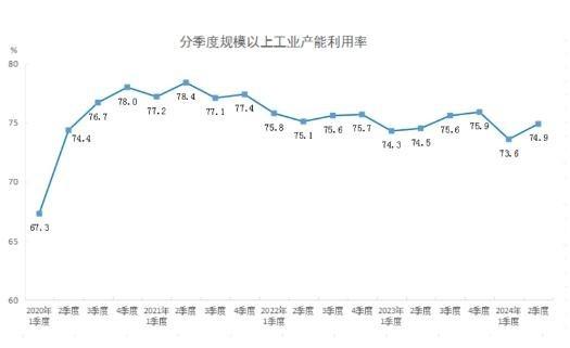據(jù)國(guó)家統(tǒng)計(jì)局網(wǎng)站消息,2024年二季度,全國(guó)規(guī)模以上工業(yè)產(chǎn)能利用率為74.9%,比上年同期上升0.4個(gè)百分點(diǎn),比一季度上升1.3個(gè)百分點(diǎn)。