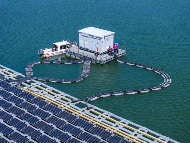 國網(wǎng)山東電力員工在世界單體最大水上漂浮式光伏電站協(xié)助用戶開展設(shè)備運行維護。