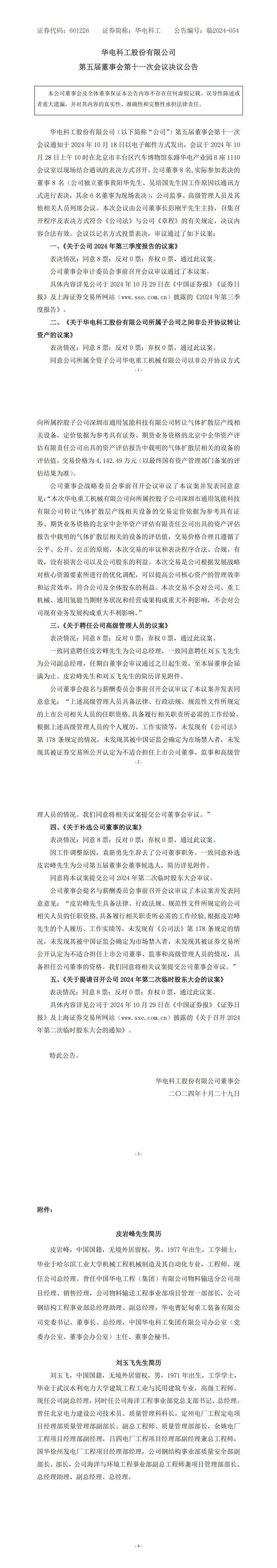 10月29日,華電科工發(fā)布公告,公司召開第五屆董事會第十一次會議,一致同意聘任皮巖峰先生為公司總經(jīng)理,一致同意聘任劉玉飛先生為公司副總經(jīng)理,任期自董事會審議通過之日起生效,至本屆董事會屆滿為止。因工作調(diào)整原因,袁新勇先生辭去公司董事職務(wù)。一致同意補(bǔ)選皮巖峰先生為公司第五屆董事會董事候選人。