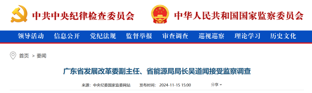 中央紀委國家監(jiān)委網(wǎng)站11月15日消息, 據(jù)廣東省紀委監(jiān)委消息:廣東省發(fā)展改革委副主任、省能源局局長吳道聞涉嫌嚴重違法,目前正接受廣東省監(jiān)委監(jiān)察調查。