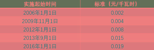 表3:可再生能源電價(jià)附加征收標(biāo)準(zhǔn)歷年變化(單位:元/千瓦時(shí))