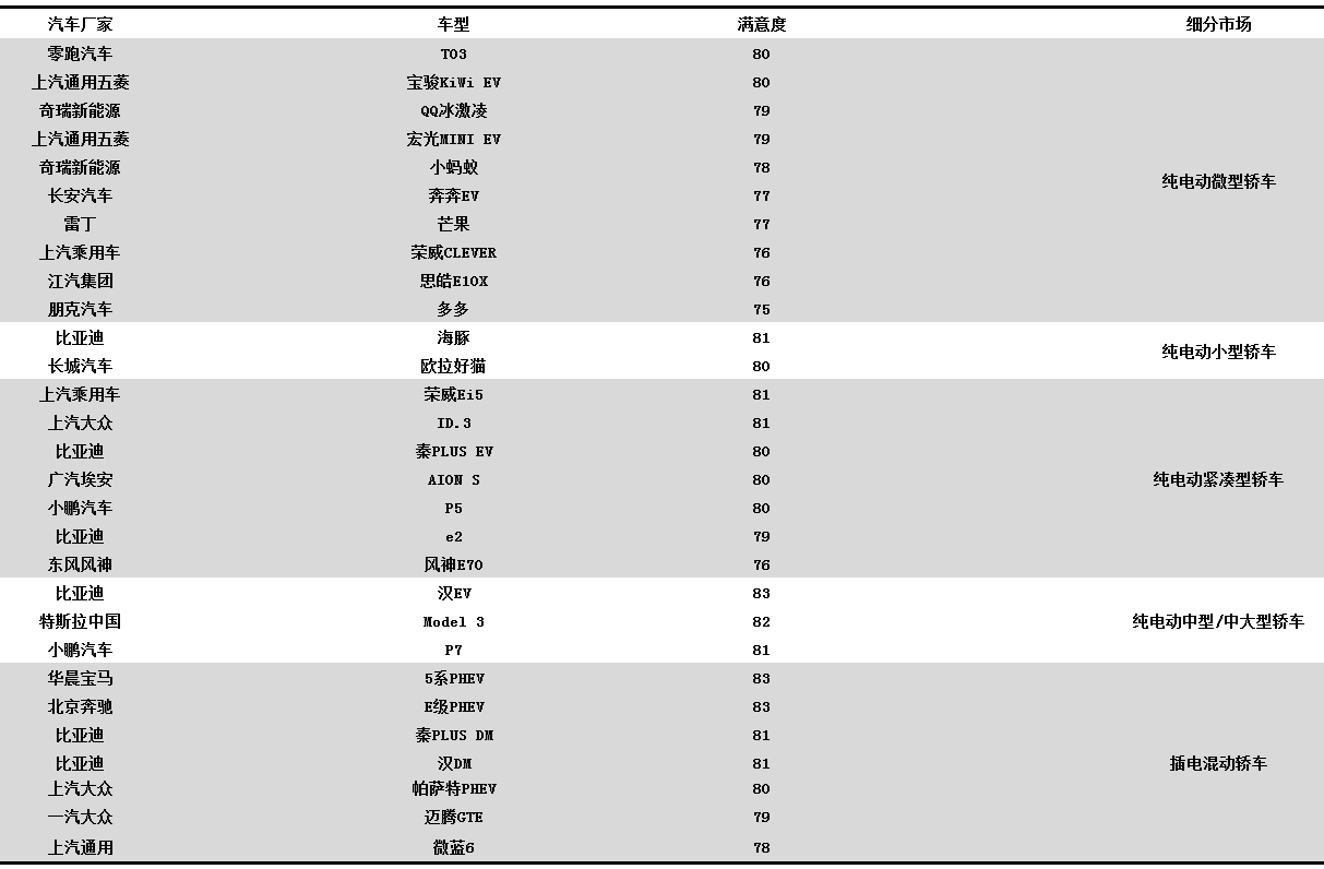 各細(xì)分市場新能源汽車綜合滿意度指數(shù)第一的車型分別是: