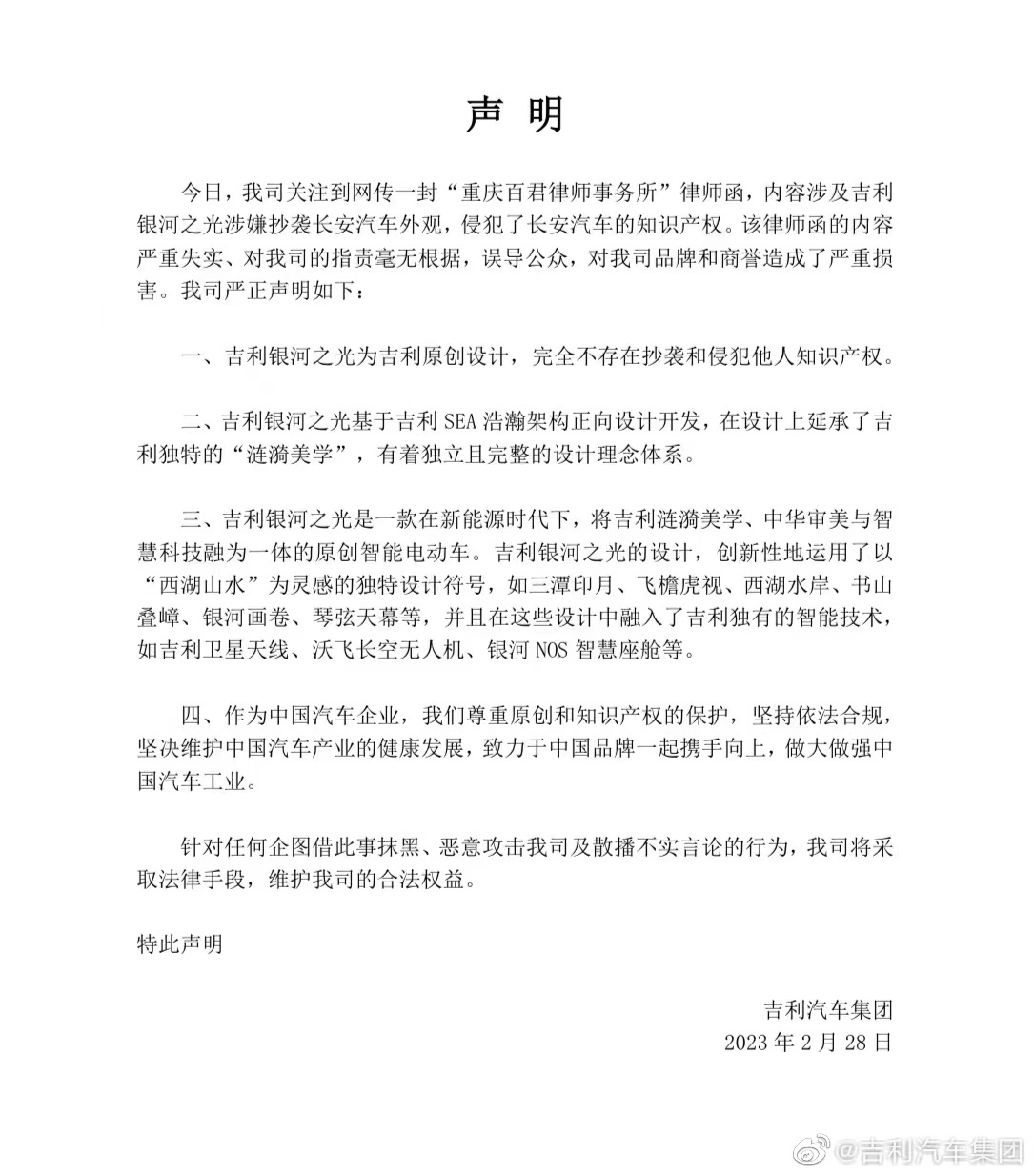 這封律師函曝光幾個小時之后,吉利汽車集團(tuán)就在官方微博發(fā)表了一份聲明。