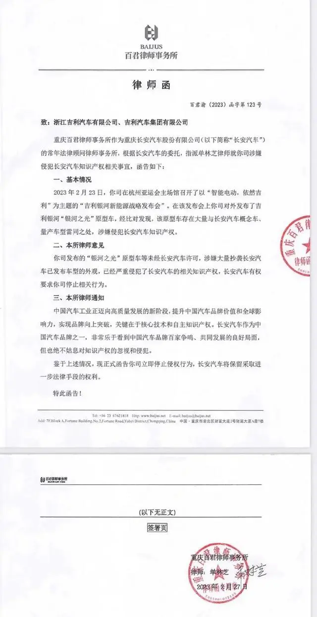 這封律師函的落款時間為2023年2月27日,其中寫道:吉利汽車在2月23日的“吉利銀河新能源戰(zhàn)略發(fā)布會”上發(fā)布的“銀河之光”原型車與長安汽車概念車、量產(chǎn)車存在大量雷同之處,吉利汽車涉嫌侵犯長安汽車知識產(chǎn)權(quán)。