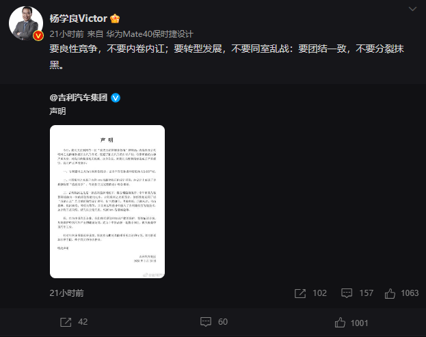 浙江吉利控股集團(tuán)高級副總裁楊學(xué)良隨后轉(zhuǎn)發(fā)了該聲明,并表達(dá)了個人觀點,表示:要良性競爭,不要內(nèi)卷內(nèi)訌;要轉(zhuǎn)型發(fā)展,不要同室亂戰(zhàn);要團(tuán)結(jié)一致,不要分裂抹黑。