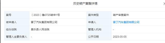 日前,公開信息顯示,雷丁汽車集團有限公司新增一則破產(chǎn)審查案件,案號為(2023)魯0725破申1號,申請人和被申請人均為雷丁汽車集團有限公司,經(jīng)辦法院為山東省濰坊市昌樂縣人民法院。