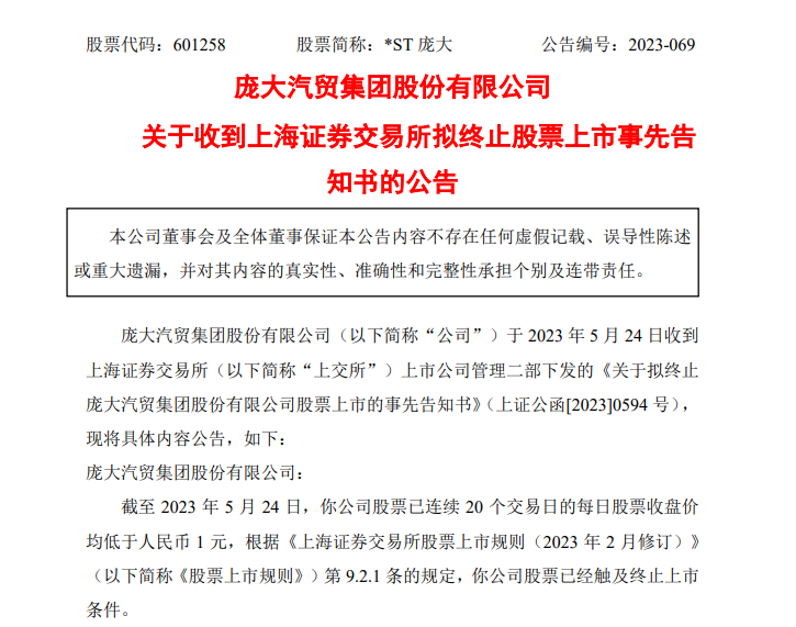 《告知書》顯示,截至2023年5月24日,龐大集團(tuán)股票收盤價(jià)已連續(xù)20個(gè)交易日低于人民幣1元,根據(jù)《上海證券交易所股票上市規(guī)則(2023年2月修訂)》規(guī)定,龐大集團(tuán)股票已經(jīng)觸及終止上市條件,上交所依據(jù)相關(guān)規(guī)定對(duì)龐大集團(tuán)股票作出終止上市的決定。
