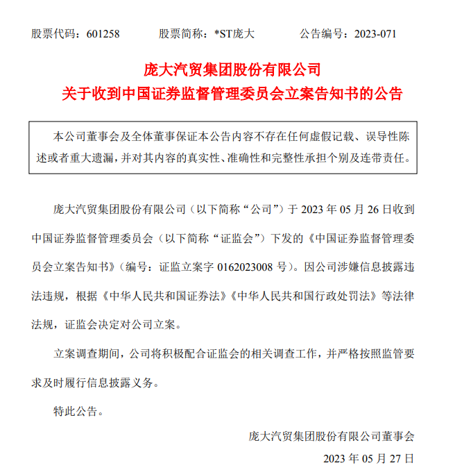 5月26日,*ST龐大再發(fā)公告稱,公司于5月26日收到中國(guó)證券監(jiān)督管理委員會(huì)(以下簡(jiǎn)稱證監(jiān)會(huì))下發(fā)的《中國(guó)證券監(jiān)督管理委員會(huì)立案告知書》。因公司涉嫌信息披露違法違規(guī),根據(jù)相關(guān)法律法規(guī),證監(jiān)會(huì)決定對(duì)公司立案。立案調(diào)查期間,公司將積極配合證監(jiān)會(huì)的相關(guān)調(diào)查工作,并嚴(yán)格按照監(jiān)管要求及時(shí)履行信息披露義務(wù)。