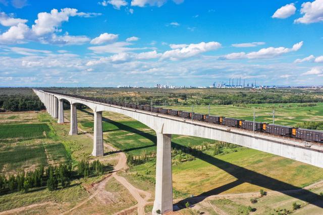 這是在準(zhǔn)格爾旗境內(nèi)拍攝的運(yùn)煤專列(7月8日攝,無人機(jī)照片)。