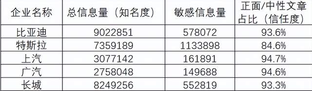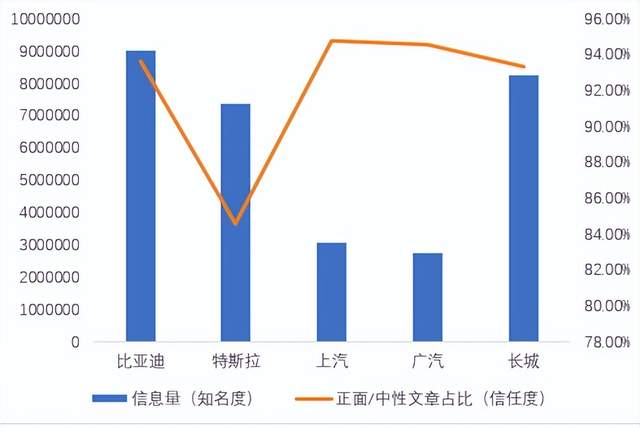 根據(jù)人民數(shù)據(jù)資產(chǎn)服務(wù)平臺數(shù)據(jù)顯示,截至2023年9月底,比亞迪、特斯拉、上汽、廣汽、長城的總信息量(知名度)和正面/中性文章占比(信任度)呈現(xiàn)出一定的特點。