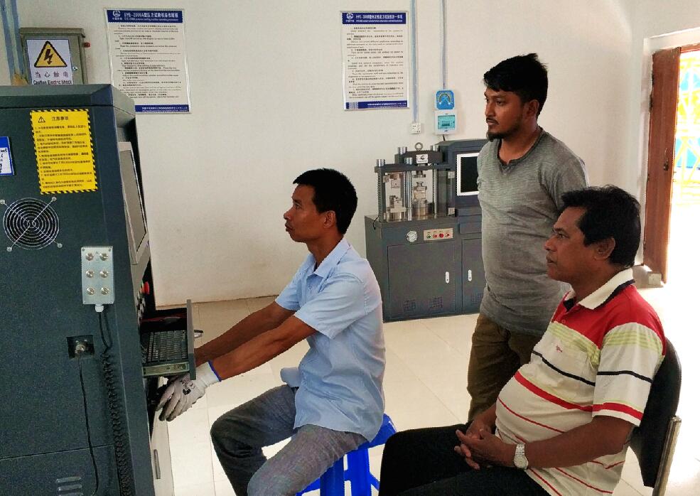 項目試驗室建設引進了國內(nèi)項目比較常用的萬能試驗機、壓力試驗機、水泥抗壓抗折一體機、電動擊實儀、EV2試驗儀、洛氏硬度計、扭矩試驗儀、螺栓抗滑試驗儀等40臺套主要試驗儀器,多數(shù)是由電腦控制,屬于先進設備。此后,項目試驗室主任陳立根成了大家的“中國師傅”,帶領(lǐng)16名孟籍試驗員一起學習研究業(yè)主招標文件和技術(shù)規(guī)格書,手把手教授使用各種試驗儀器設備,帶領(lǐng)大家一起開展路基填料、混凝土配比試拌、鋼筋試驗等。“他毫無保留地把自己掌握的試驗操作規(guī)程都教給了我們。”然森很慶幸自己擁有這樣一位“中國師傅”。