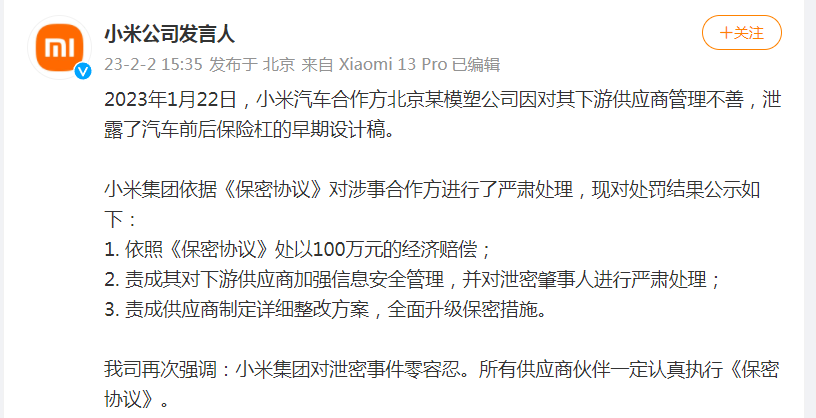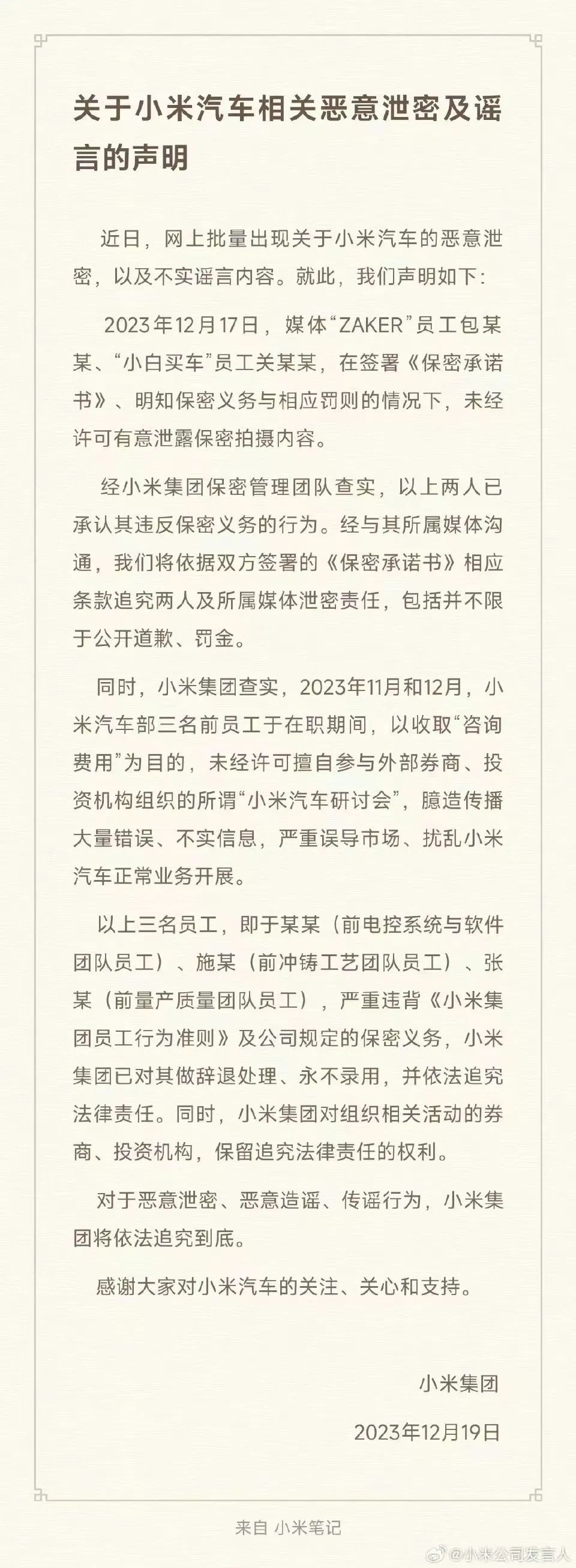 《聲明》稱,2023年12月17日,媒體“ZAKER”員工包某某、“小白買車”員工關某某,在簽署《保密承諾書》、明知保密義務與相應罰則的情況下,未經(jīng)許可有意泄露保密拍攝內容。經(jīng)小米集團保密管理團隊查實,以上兩人已承認其違反保密義務的行為。經(jīng)與其所屬媒體溝通,小米集團將依據(jù)雙方簽署的《保密承諾書》相應條款追究兩人及所屬媒體泄密責任,包括并不限于公開道歉、罰金。另外,《聲明》介紹,2023年11月和12月,小米汽車部三名前員工于在職期間,以收取“咨詢費用”為目的,未經(jīng)許可擅自參與外部券商、投資機構組織的所謂“小米汽車研討會”,臆造傳播大量錯誤、不實信息,嚴重誤導市場、擾亂小米汽車正常業(yè)務開展。以上三名員工,即于某某(前電控系統(tǒng)與軟件團隊員工)、施某(前沖鑄工藝團隊員工)、張某(前量產(chǎn)質量團隊員工),嚴重違背《小米集團員工行為準則》及公司規(guī)定的保密義務,小米集團已對其做辭退處理、永不錄用,并依法追究法律責任。同時,小米集團表示,對組織相關活動的券商、投資機會,保留追究法律責任的權利。小米汽車始終吸引市場高度關注,這也不是小米集團第一次遭遇汽車泄密。今年1月22日,小米汽車合作方北京某模塑科技有限公司因對其下游供應商管理不善,泄露了小米汽車前后保險杠的早期設計稿。“小米公司發(fā)言人”微博今年2月更新了該泄密事件的處理結果:小米集團表示,已依據(jù)《保密協(xié)議》對涉事合作方進行了嚴肅處理,包括依照《保密協(xié)議》處以100萬元的經(jīng)濟賠償;責成其對下游供應商加強信息安全管理,并對泄密肇事人進行嚴肅處理;責成供應商制定詳細整改方案,全面升級保密措施。