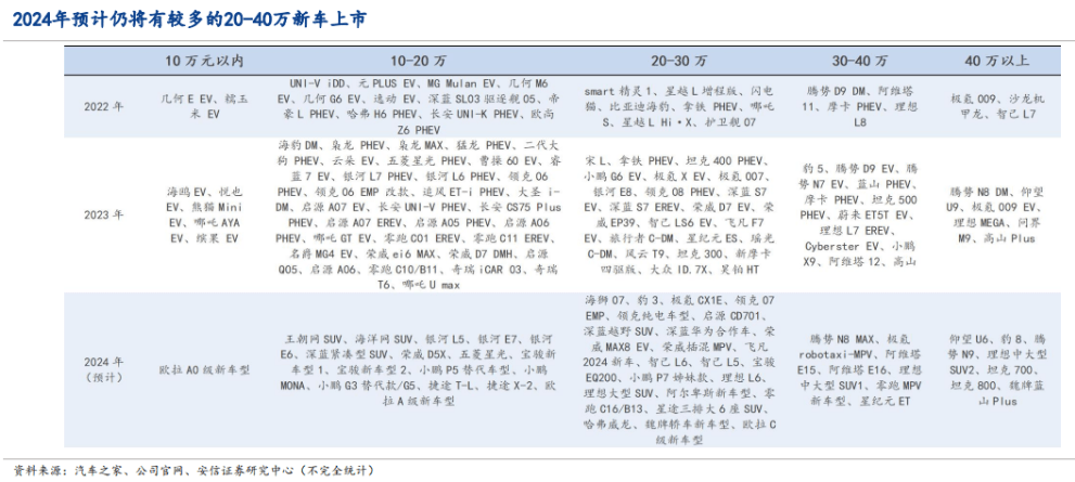 安信證券研究中心發(fā)布的研究報告認為,新能源車高端化仍有較大的空間。在40萬元以上的市場中,新能源汽車滲透率相對較低,相關數據顯示,2023年1-10月僅為17.5%,與40萬以下市場相比,新能源滲透率仍有較大的提升空間。安信證券研究中心預測,2024年高端新能源車銷量及占比有望持續(xù)提升,在多款全新高端車型上市的催化下,2024年20萬-30萬元、30萬-40萬、40萬元以上新能源車銷售占比將達28.4%、11.4%及6%,新能源車行業(yè)結構有望進一步高端化。