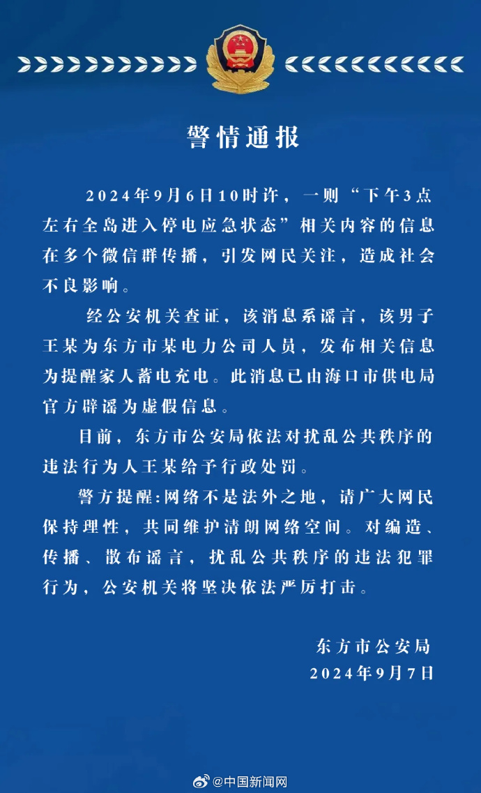 經公安機關查證,該消息系謠言,該男子王某為東方市某電力公司人員,發(fā)布相關信息為提醒家人蓄電充電。目前,東方市公安局依法對擾亂公共秩序的違法行為人王某給予行政處罰。