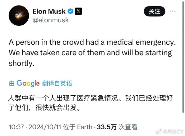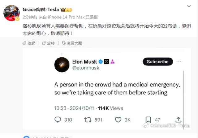 北京時間10月11日消息,原定于北京時間10點舉行的特斯拉Robotaxi發(fā)布會已經(jīng)推遲了半個小時,至今還未開始。正當大家紛紛猜測緣由時,馬斯克在社交媒體上公布了原因,稱現(xiàn)場有人突發(fā)疾病暈倒需要照顧,因此發(fā)布會推遲舉行,但他未確定具體開始的時間。