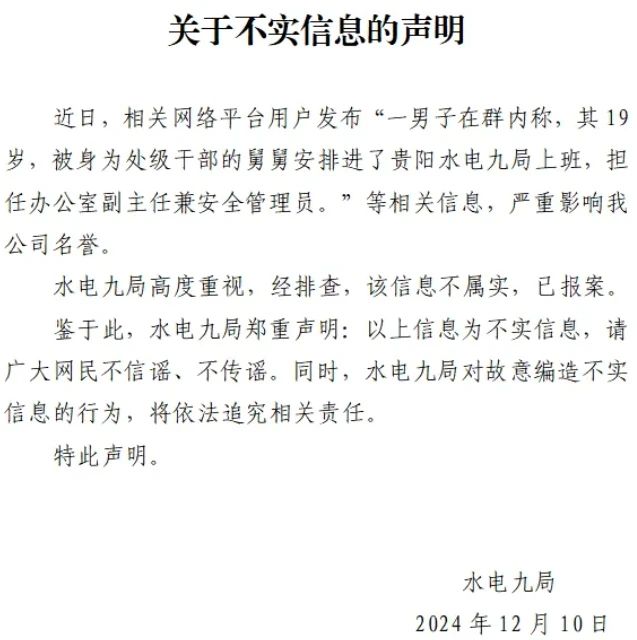 男子稱19歲被舅舅安排任辦公室副主任?水電九局聲明:信息不實(shí),已報(bào)案。