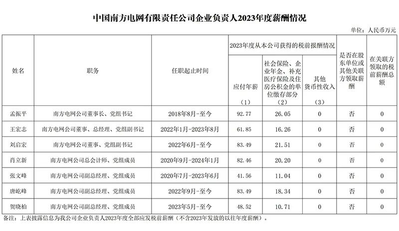 1. 孟振平,南方電網(wǎng)公司董事長、黨組書記,自2018年8月至今任職,2023年度從本公司獲得的稅前報酬為92.77萬元人民幣。