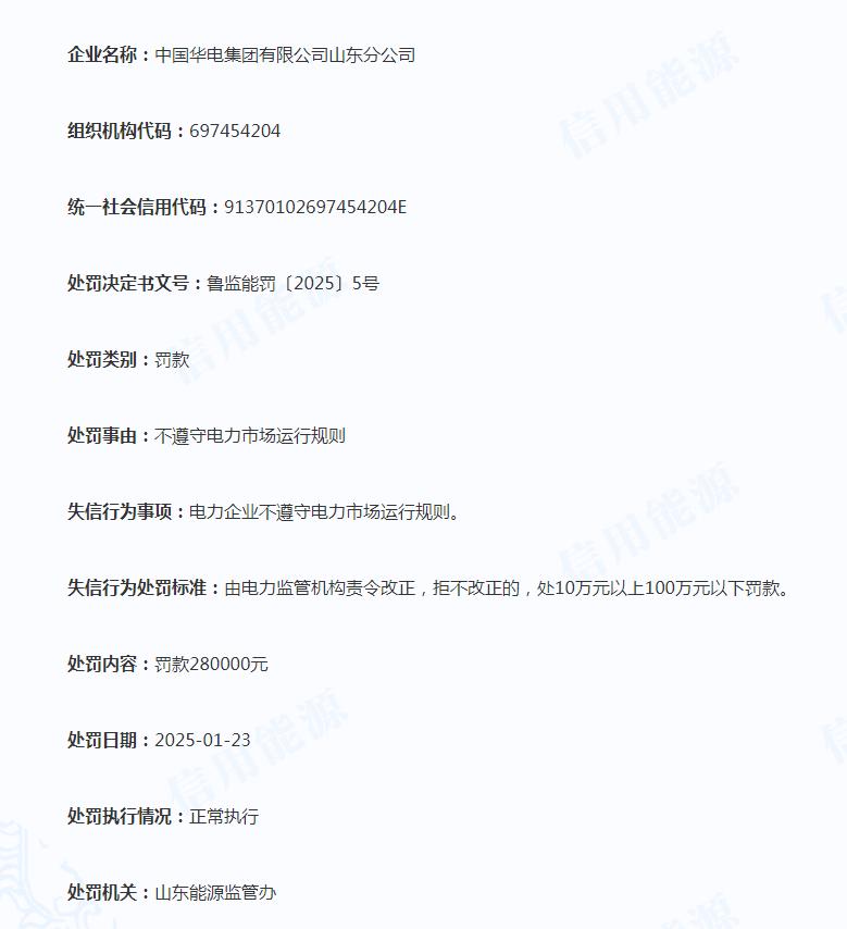 日前,信用能源公布了對中國華電集團(tuán)有限公司山東分公司的行政處罰決定,魯監(jiān)能罰〔2025〕5號處罰決定書文號顯示,中國華電集團(tuán)有限公司山東分公司不遵守電力市場運行規(guī)則,山東能源監(jiān)管辦對其作出罰款280000元處罰。