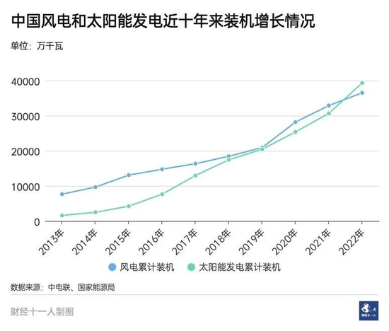 在可再生能源領域,風電裝機量一直都領先于太陽能發(fā)電;2022年,兩者位置互換,中國太陽能發(fā)電裝機量首次超過了風電。