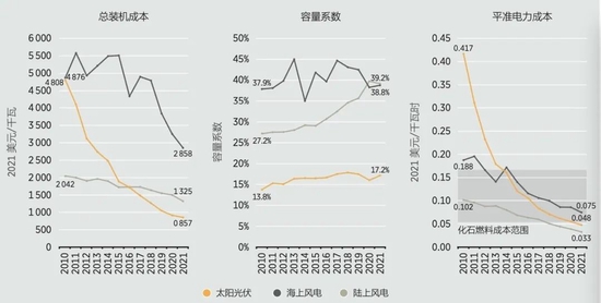 全球光伏、陸上和海上風電的成本下降(2010-2021年) 數(shù)據(jù)來源:根據(jù)國際可再生能源署(IRENA)