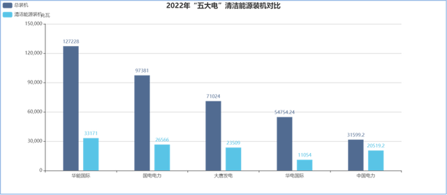 2022年,煤炭?jī)r(jià)格依舊處于高位,全年北方港5500大卡動(dòng)力煤市場(chǎng)均價(jià)為1296元/噸,同比上漲24.2%。體現(xiàn)在業(yè)績(jī)層面上,“五大電”中清潔能源裝機(jī)占比越高的企業(yè),越能夠受益于這樣的市場(chǎng)環(huán)境,從而造成業(yè)績(jī)極端分化。