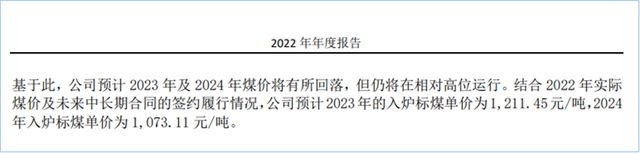 在2022年財(cái)報(bào)中,華能?chē)?guó)際明確表示預(yù)計(jì)2023年及2024年煤價(jià)將有所回落,但仍將在相對(duì)高位運(yùn)行。并以南京電廠舉例,結(jié)合2022年實(shí)際煤價(jià)及未來(lái)中長(zhǎng)期合同的簽約履行情況,預(yù)計(jì)2023年的入爐標(biāo)煤?jiǎn)蝺r(jià)為1,211.45元/噸,2024年入爐標(biāo)煤?jiǎn)蝺r(jià)為1,073.11元/噸。