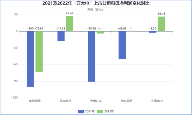 2022年,中國(guó)電力歸母凈利潤(rùn)為26.48億元,2021年為-2.56億元,同比扭虧為盈;國(guó)電電力歸母凈利潤(rùn)為27.47億元,2021年為-17.33億元,同比扭虧為盈;華電國(guó)際歸母凈利潤(rùn)為1億元,2021年為-49.82億元,同比扭虧為盈;大唐發(fā)電歸母凈利潤(rùn)為-4.1億元,2021年為-90.98億元,同比增長(zhǎng)95.49%;華能?chē)?guó)際歸母凈利潤(rùn)為-73.87億元,2021年為-100億元,虧損額度有所減少。
