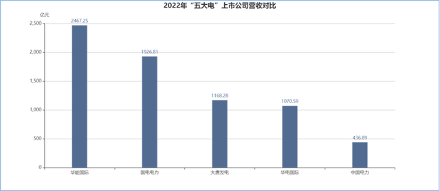 2022年,“五大電”旗下主體發(fā)電上市公司營(yíng)收皆有增長(zhǎng),但座次沒(méi)有發(fā)生太大變化,華能?chē)?guó)際以2467.25億營(yíng)收依舊領(lǐng)銜。