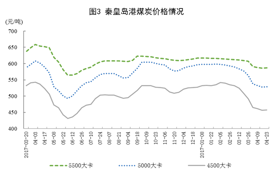 煤炭價格有所下跌。截至4月底,秦皇島5500大卡煤炭平倉價為每噸587元,比3月底下降20元;5000大卡每噸529元,下降35元;4500大卡每噸457元,下降34元。