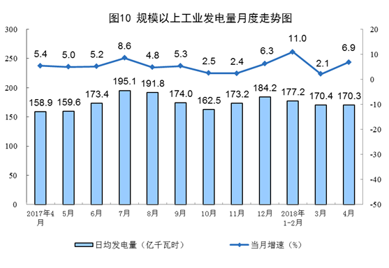 4月份,受用電需求增加影響,電力生產(chǎn)明顯加快,發(fā)電量5107.8億千瓦時,同比增長6.9%,增速比上月加快4.8個百分點。1-4月份,發(fā)電量同比增長7.7%,增速較1-3月份回落0.3個百分點。